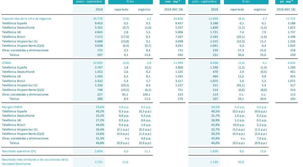 En esta línea, el flujo de caja libre se situó en septiembre en 2.957 millones de euros, un 8,3% menos que en el mismo periodo de 2017, aunque si se excluyen los pagos de espectro aumentó un 0,9%. El flujo de caja operativo alcanzó los 6.354 millones de euros, un 0,7% más en términos reportados y un 2,9% más en términos orgánicos.