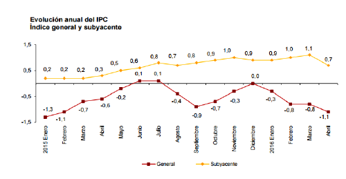 El índice de precios de consumo (IPC) cae en abril el 1,1% en tasa interanual, tres décimas más que en marzo. Se debe, principalmente, a los precios más baratos de los viajes organizados y de la electricidad, según el Instituto Nacional de Estadística (INE). Es la cifra más baja desde febrero de 2015, marcada especialmente por el descensos de los precios del ocio, hoteles y restaurantes tras el fin de la Semana Santa en el mes de marzo.