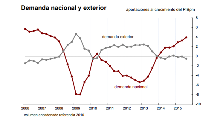 Detrás de este crecimiento está la mayor aportación de la demanda nacional, que ha compensado la contribución más negativa de la demanda externa. Esta tasa anual de crecimiento del PIB es la más elevada desde el cuarto trimestre de 2007. Así, la demanda nacional contribuye en 3,9 puntos al crecimiento anual del PIB en el tercer trimestre. Supone seis décimas más que en el periodo anterior. Por su parte, la demanda exterior disminuye su aportación al PIB trimestral en cuatro décimas, a -0,5 puntos.