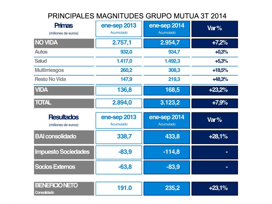Mutua Madrileña logró incrementar sus ingresos hasta los 3.123 millones de euros a septiembre, lo que supone un aumento del 7,9% respecto al mismo periodo de 2013, y un fuerte contraste con el tono ligeramente negativo del sector (-0,9%)