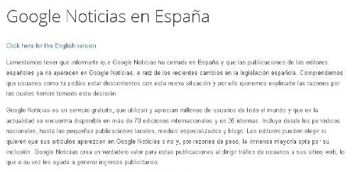 El servicio de noticias ha dejado de funcionar esta madrugada, debido a la nueva Ley de Propiedad Intelectual, que obliga el pago de un canon por reseña de prensa a partir del próximo 1 de enero. En un comunicado publicado en la página, Google lamenta el cierre y asegura comprender el "descontento" de los usuarios con la situación, al tiempo que ha subrayado que seguirá manteniendo su "compromiso" de "ayudar y trabajar con el sector de la información".