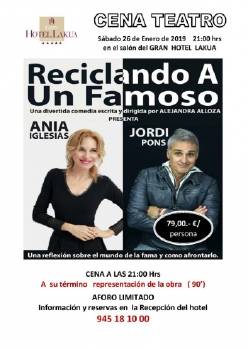 Por todo ello, el próximo sábado 26 de enero de 2019, Gran Hotel Lakua ha querido apostar por un novedoso formato y llevar hasta sus salones la comedia ‘Reciclando a un famoso’. Esa noche mágica comenzará con una cena ligera en el salón, que al terminar, dará paso a la obra de ficción cuya puesta en escena es de entre 80 y 90 minutos. En ese instante el teatro cobrará vida en el mismísimo hotel ante la mirada de sus comensales. Una fórmula original, pensada para el disfrute de los espectadores en una noche insólita e irrepetible.