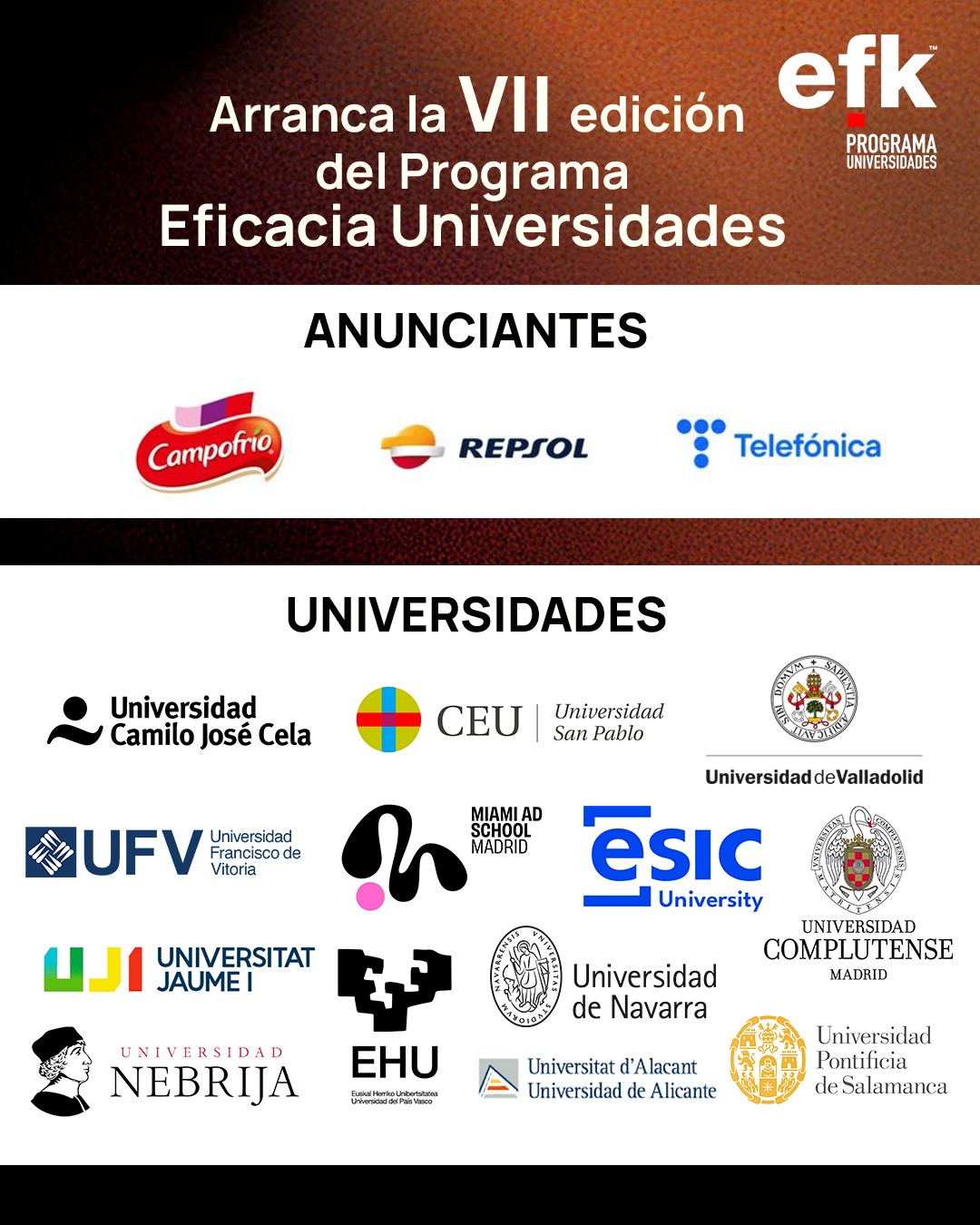 Como novedad, este año se suma la Universidad Complutense al resto de elenco de centros compuesto por: Camilo José Cela, San Pablo CEU, ESIC, Francisco de Vitoria, Miami Ad School, U. de Alicante, U. Jaume I, U. de Navarra, U. Nebrija, U. del País Vasco, U. de Salamanca y U. de Valladolid.